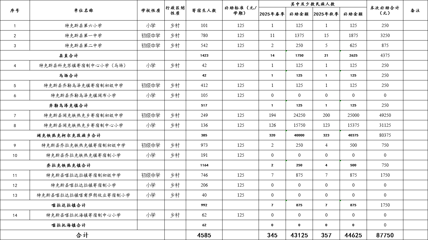 特克斯县义务教育2025年寄宿生中及少数民族补助资金统计表