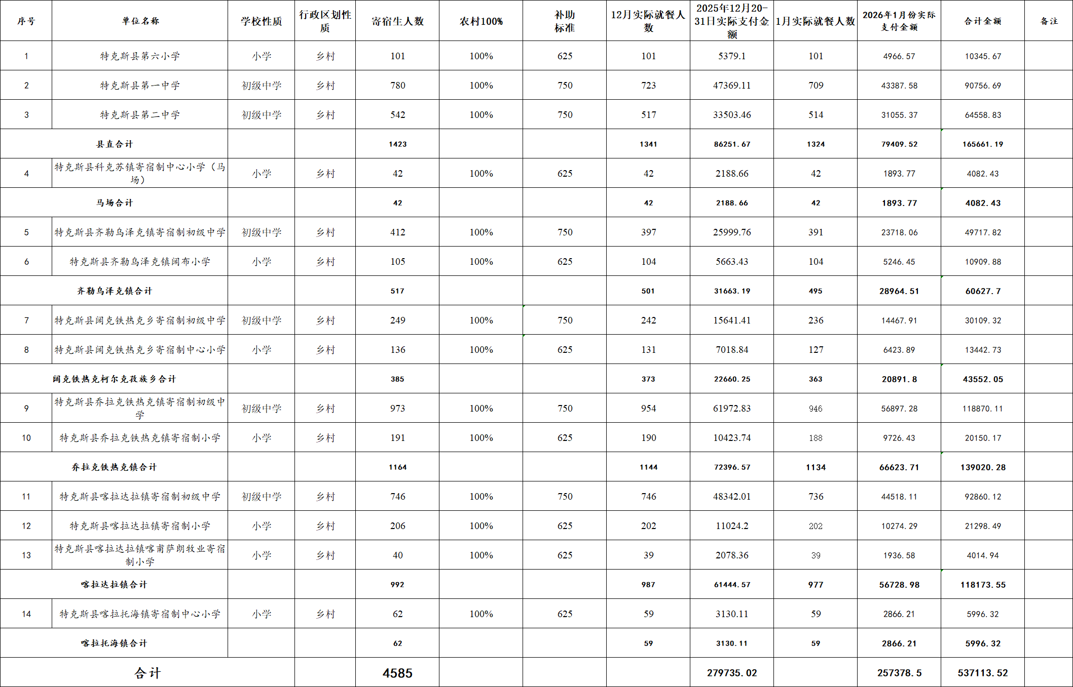 特克斯县义务教育2025年12月20-31日及2026年1月份实际支付寄宿生生活补助款统计表(公示)