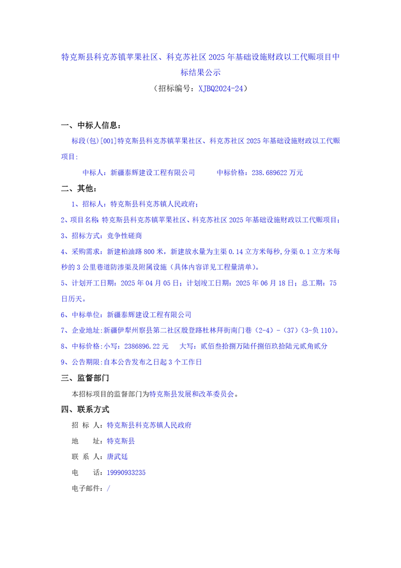 特克斯县科克苏镇苹果社区、科克苏社区2025年基础设施财政以工代赈项目中标结果公示