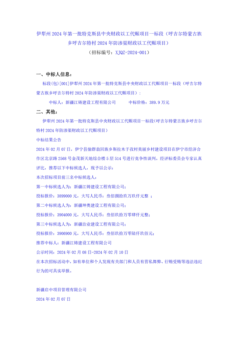 伊犁州2024年第 一 批特克斯县中央财政以工代赈项目 一 标段(呼吉尔特蒙古族乡呼吉尔特村2024年防渗渠财政以工代赈项目)