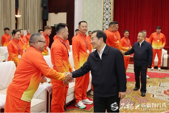 12月4日,自治区党委书记陈小江、自治区主席艾尔肯·吐尼亚孜同载誉归来的第十五届全国运动会新疆体育代表团获奖运动员、教练员代表亲切交谈,代表自治区党委和政府向他们表示热烈祝贺。石榴云/新疆日报记者崔志坚摄