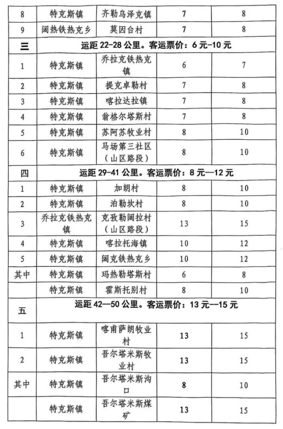 《关于特克斯县农村客运票价重新核定的申请》已收悉,根据《政府制定价格成本监审办法》(国家发改委令2017年第8号)、《新疆维吾尔自治区定价目录》(新政发[2023]34号)、关于贯彻落实《交通运输部国家发展改革委深化道路运输价格改革的意见》的通知(新交运[2020]7号)等文件精神,依法依规履行政府定价(指导价)相关程序,经县人民政府2025年第29次常务会研究同意,根据《关于同意调整特克斯县农村客运票价的批复》(特政函[2025]278号)文件,现将关于调整特克斯县农村道路客运班车票价收费标准有关事宜通知如下: