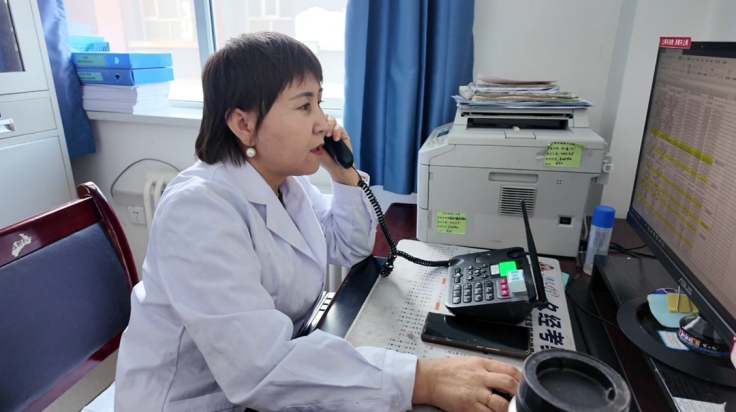 △特克斯县特克斯镇卫生院预防接种中心主任乔丽正打电话联系学生家长 赛丽曼摄