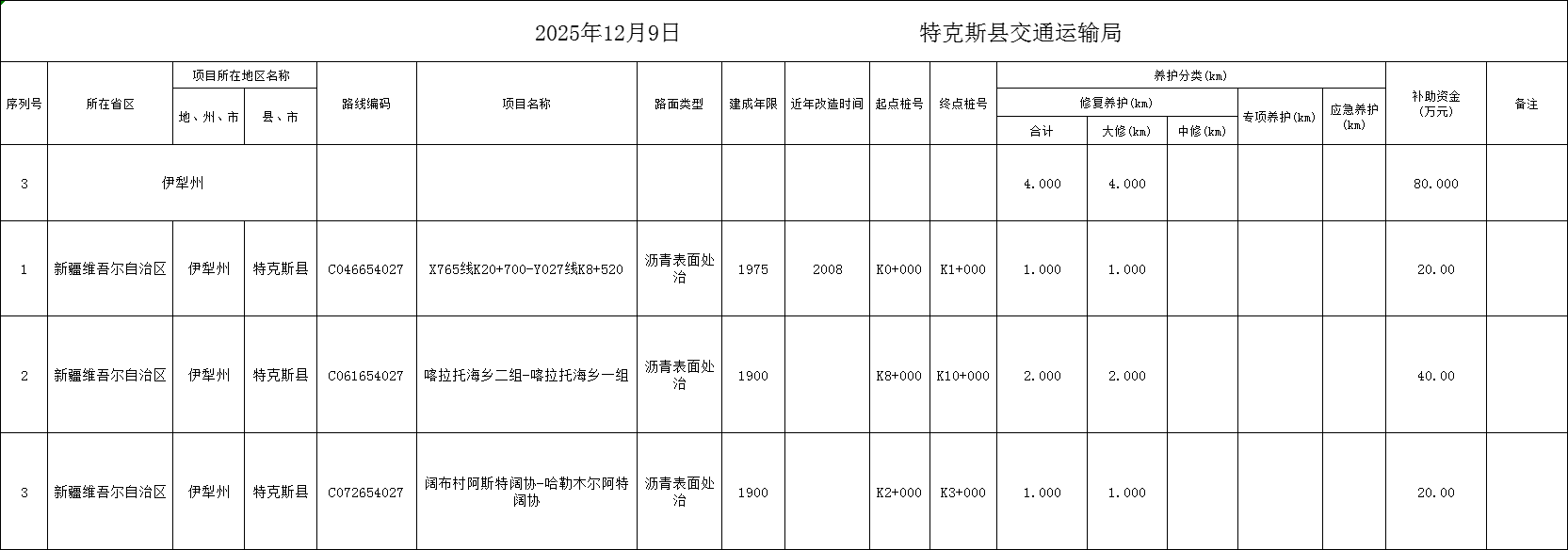 特克斯县2025年政府还贷二级公路取消收费后补助资金用于农村公路养护工程项目计划表