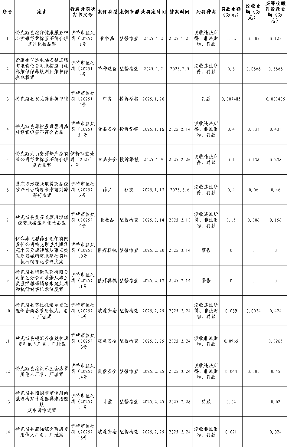 特克斯县市场监督管理局2025年第一季度行政处罚案件公示
