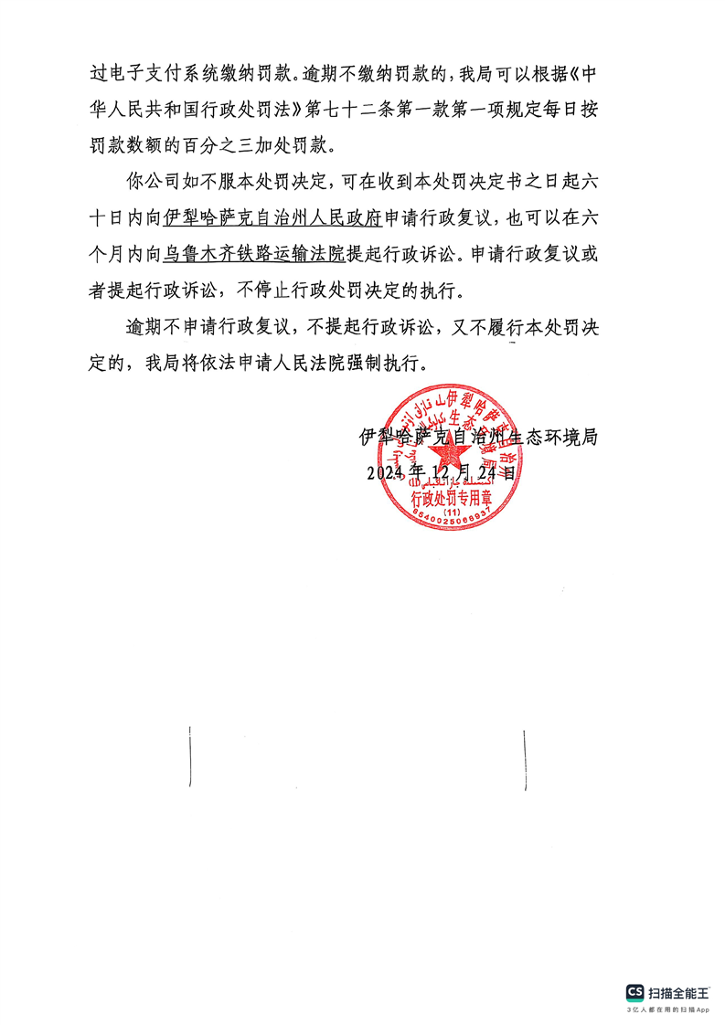 伊犁哈萨克自治州生态环境局行政处罚决定书(伊州环特[2024]2号)