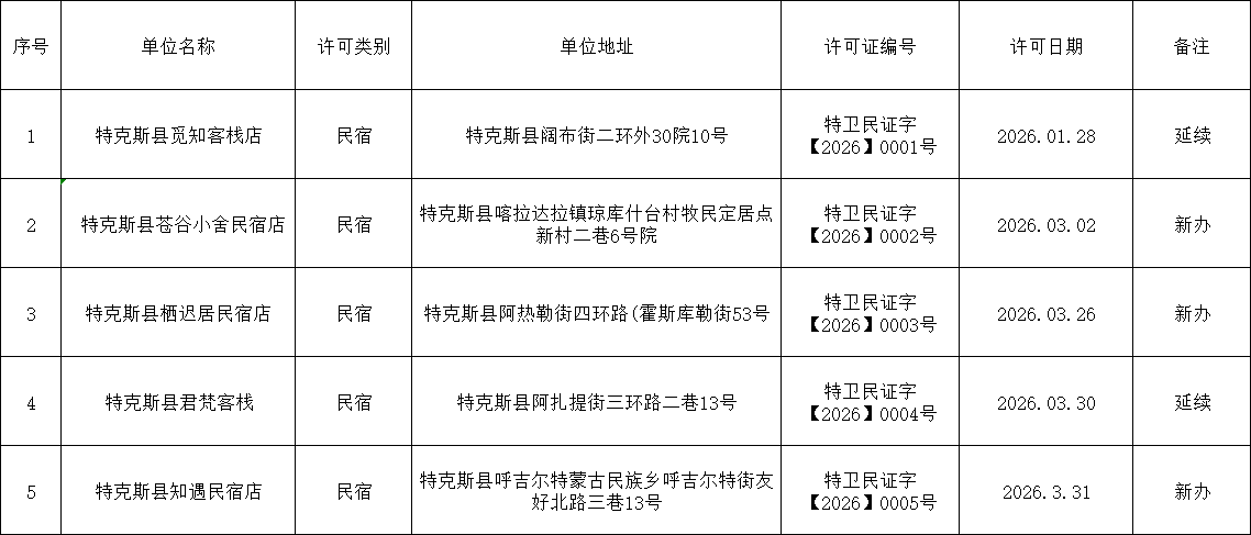 特克斯县卫健委2026年第一季度民宿行政许可证登记表