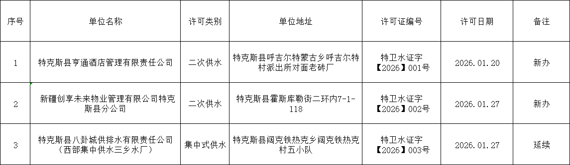 特克斯县卫健委2026年第一季度生活饮用水行政许可证登记表