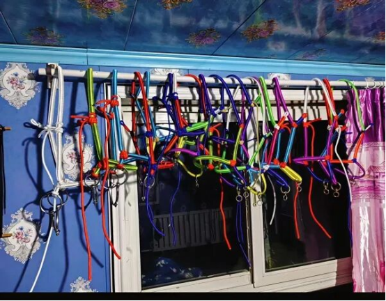 作为家族第二代传承人,努尔波力从小跟随父辈学习选材、编织、定型,练就了“一眼辨材质、一绳定版型”的绝活。“做马具最讲究良心,必须选用耐磨损的优质彩绳,编织时每平方厘米的绳结不能少于8个,这样才能经得住草原的风吹日晒和赛马的激烈奔跑。”他介绍,传统马具不仅是生产生活工具,更承载着民族文化记忆,如马笼头上的“生命结”纹样,便寄托着牧民对平安顺遂的美好期盼。