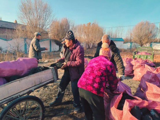 凛冽寒风挡不住现场的热呼劲儿——发放现场,干部与志愿者分工协作、默契配合,称重计量精准无误,装煤动作麻利迅速,搬运过程井然有序,一辆辆满载暖心煤的三轮车、小货车陆续驶离,奔向村民家中。针对孤寡老人、残疾人等行动不便的特殊群体,村干部主动提供“上门配送”服务,将一袋袋煤炭扛到家门口,整齐堆放在屋檐下或庭院里,以脚步丈量民情冷暖,用实干传递党和政府的深切关怀。