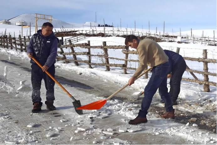 特克斯镇霍斯库勒村组织党员干部成立志愿服务队,开展道路铲冰除雪行动,及时消除安全隐患,确保群众出行安全。(县委统战部、县工商联、侨联驻特克斯镇霍斯库勒村工作队 陈佳)