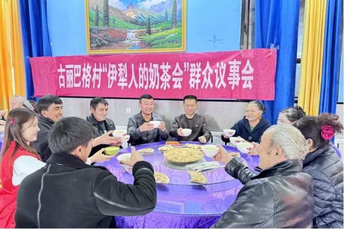 奎屯市乌鲁木齐西路街道金波园社区“两委”联合市人力资源和社会保障局驻社区工作队,开展“伊犁人的奶茶会”群众议事活动,大家围坐一起,在奶茶香中唠家常、展才艺,进一步凝聚社区向心力。(奎屯市乌鲁木齐西路街道金波园社区党总支 杜楠 供稿)