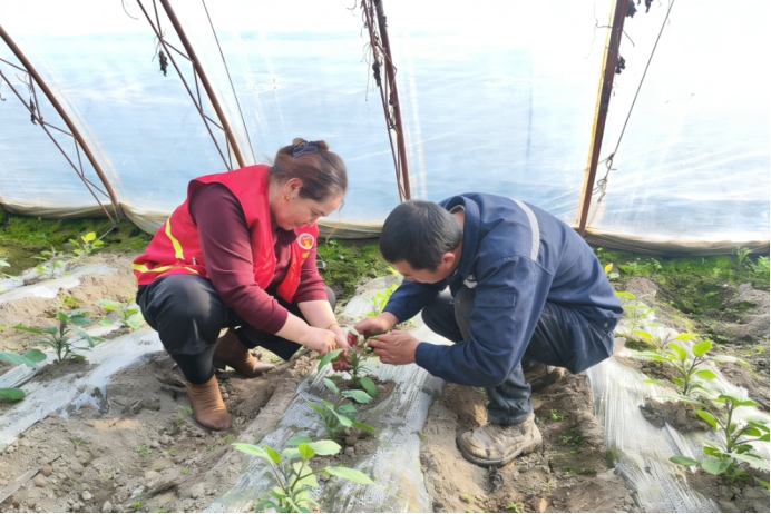 察布查尔县绰霍尔镇龙沟村组织党员志愿者走进温室大棚,开展梳枝打杈、整理株型等作业,有效缓解农忙用工压力,用实际行动助力农户做好茄苗管护。(察布查尔县绰霍尔镇龙沟村党支部 张廷波 供稿)