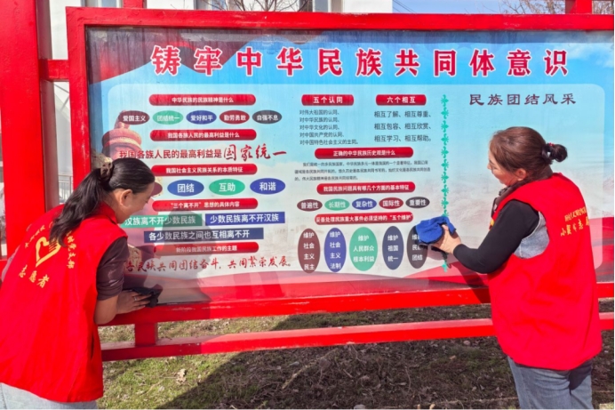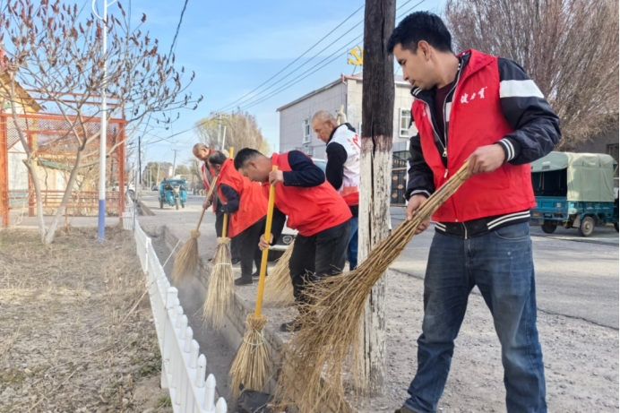 尼勒克县木斯镇托铁村组织志愿者和群众开展美化乡村环境卫生整治活动,清理主干道两侧垃圾、枯枝杂草等,并清洁沿途宣传栏等公共设施,以实际行动美化村容村貌。(州生态环境局尼勒克县分局驻木斯镇托铁村工作队 孟海霞 供稿)