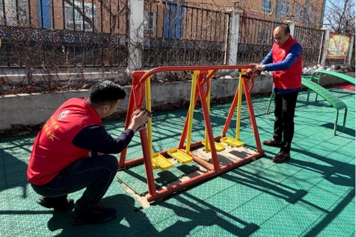 特克斯县特克斯镇东城幸福社区对辖区健身器材及儿童滑梯进行清洁维护,营造整洁舒心的健身娱乐环境。(特克斯县委组织部、老干部局、党校驻特克斯镇东城幸福社区工作队 奴尔孜亚·阿布都卡哈尔 供稿)