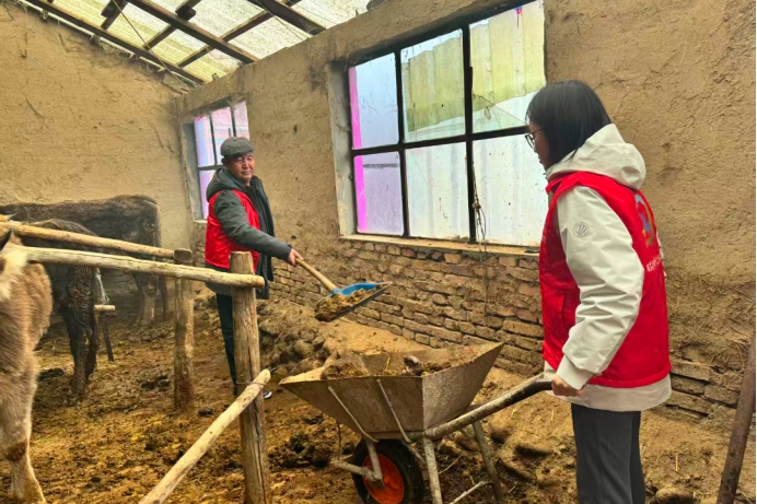巩留县吉尔格郎乡沙尕村组织志愿者帮助牧民打扫院落、喂养牛羊,助力美化人居环境。(巩留县交通运输局驻巩留县吉尔格郎乡沙尕村驻村工作队 罗朋 供稿)