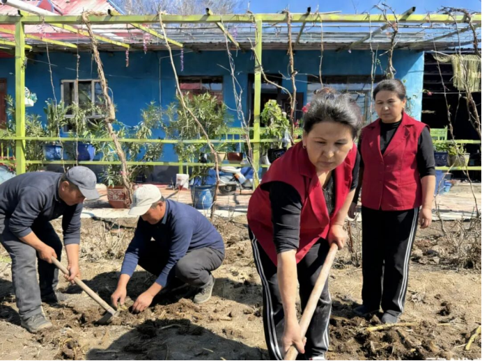 伊宁县巴依托海镇上塔依尔于孜村和州人民法院、县人民法院驻村工作队,组织党员群众开展美化家园行动,通过翻整土地、栽种绿植、打理庭院等方式,绘就和美乡村新图景。(伊宁县巴依托海镇上塔依尔于孜村党支部 依丽米努尔·阿布都沙拉木 供稿)