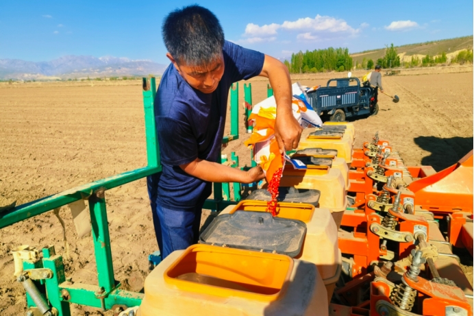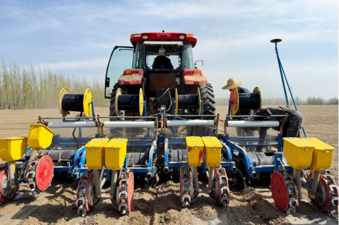 伊宁县巴依托海镇上塔依尔于孜村积极对接农户春耕需求,协调4台大型膜下滴灌播种机投入田间作业,全力保障春耕生产高效推进。(伊宁县巴依托海镇上塔依尔于孜村党支部 依丽米努尔·阿布都沙拉木供稿)