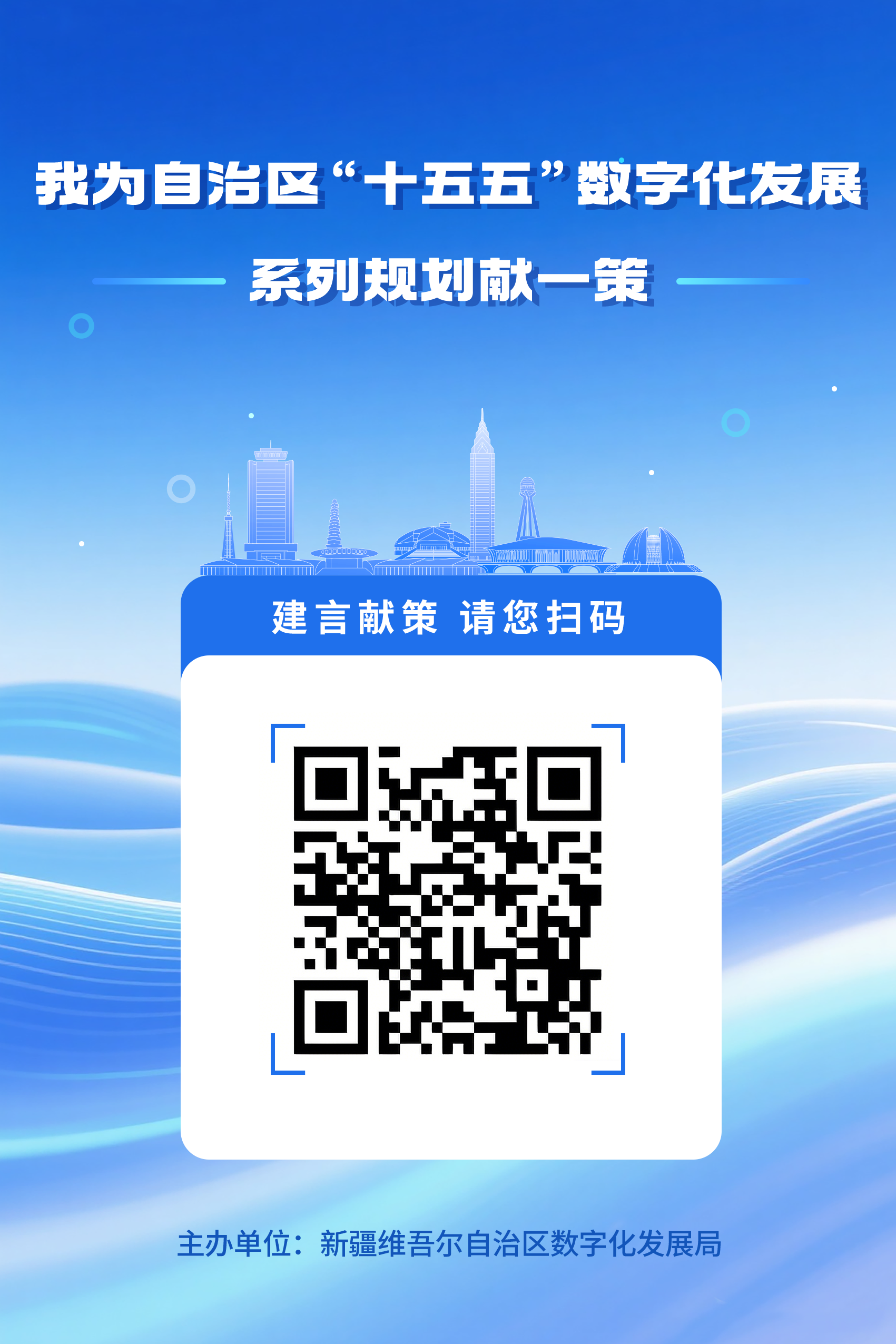 为高质量编制自治区“十五五”数字化发展系列规划,把顶层设计与问计于民统一起来,新疆维吾尔自治区数字化发展局开展“我为自治区‘十五五’数字化发展系列规划献一策”网络征集意见活动,现诚挚邀请社会各界人士、相关单位建言献策,共同擘画数字新疆的发展蓝图。 1.活动时间 2025年12月25日至2026年1月31日 2.征集内容 自治区“十五五”数字化发展系列规划以数字新疆建设为重点,围绕加强数字基础支撑能力,推动数字党建、数字政务、数字经济、数字文化、数字社会及平安新疆建设六大领域数字化转型,实现区地县乡村五级贯通,推进兵地融合等方面征集意见建议。 3.征集主体 本次活动征集对象包括各级党政机关、企事业单位、社会团体、科研院所、各类市场主体和各族群众。 4.线上征集方式