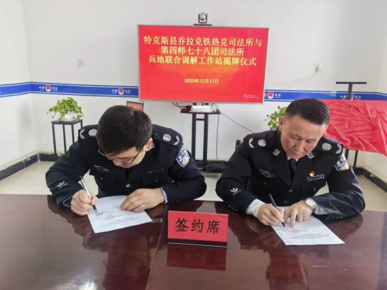 为铸牢中华民族共同体意识,深入践行新时代“枫桥经验”,打破兵地行政壁垒,深化司法行政融合共建。12月17日,特克斯县乔拉克铁热克司法所与第四师七十八团司法所联合打造的兵地联合调解工作站正式挂牌成立。这一举措标志着两地在矛盾纠纷多元化解、社会治理协同推进方面迈出关键一步,为构建“兵地一盘棋”的治理新格局注入法治动能。