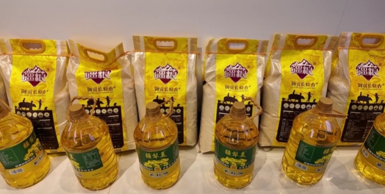 △工作人员为环卫工人逐一发放大米、面粉、食用油等生活物资 侯湘菱摄