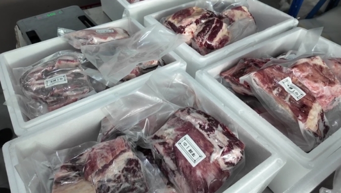 △工作人员有序完成牛羊肉产品分拣、装车等全流程操作 居哈尔毕 摄