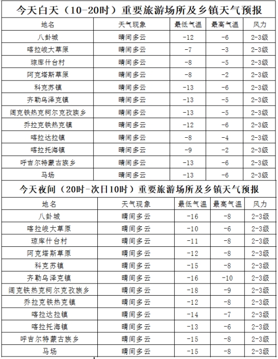 预计今天白天至夜间,我县大部以晴间多云天气为主,气温-16~-6℃,风力2-3级。