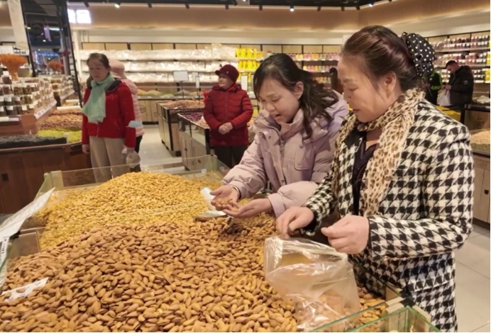 特克斯县东城幸福社区居民郭慧珍说:“快过年了,带着家人一起来置办年货,超市里商品种类齐全,各种礼盒、干果,还有新鲜的蔬菜水果、海鲜应有尽有,价格也很优惠。不管是自家吃还是走亲访友,都能一次性买齐,看着这么热闹的场面,年味儿瞬间变浓,心里也格外暖和。”