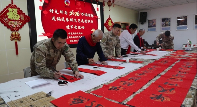 新春将至,暖意先行。2月11日,特克斯县人民武装部营区内暖意融融、温情涌动。由县退役军人事务局牵头,县人民武装部、县文学艺术界联合会协同开展的2026“万福迎春”送福送春联文艺志愿服务进军营活动顺利举行,为坚守岗位、守护一方的官兵们送去新春的诚挚祝福与深切关怀。