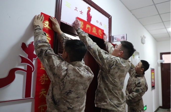 官兵们围立一旁,认真观摩书法创作,不时交流请教、挑选心仪的春联。在书法家指导下,大家纷纷提笔尝试书写,现场欢声笑语不断,暖意融融。墨迹未干,官兵们便迫不及待地将写好的春联张贴在营区门上,营区瞬间洋溢起浓浓的年味。
