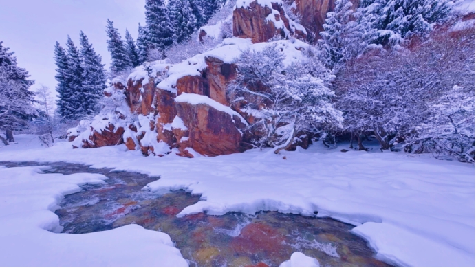 冰河未被严冰封冻,清泉依旧在白雪之间叮咚流淌,澄澈,河水映着岸边的雪色与松影,绘就一幅清冷又治愈的冬日画卷。