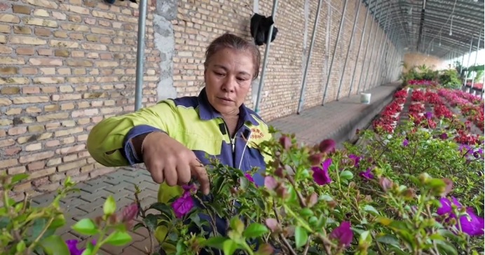 △花卉基地工人海日古丽·再努拉正在对花卉进行精细化管护 吾兰摄