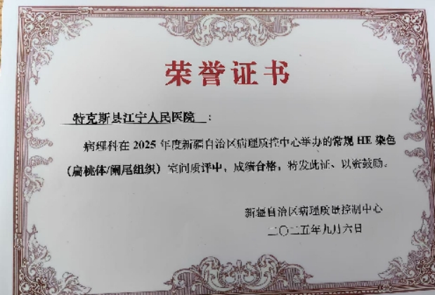 近日,自治区病理医疗质量控制中心正式公布2025年度常规病理技术质控评价结果。特克斯县江宁人民医院病理科“常规石蜡切片HE染色”项目在此次室间质量评价中表现合格,顺利通过评审,并荣获自治区病理质控中心颁发的合格荣誉证书。