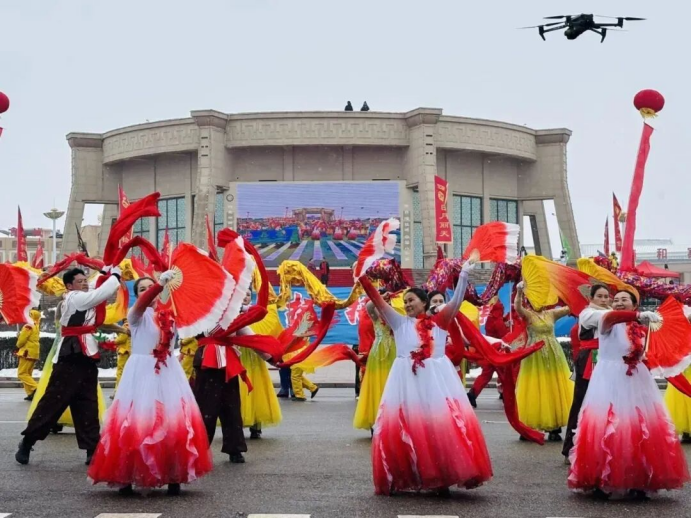当日12时,活动在号角与鼓声中拉开帷幕,八条街道同步鸣鼓,21名旗手持八卦元素旗帜绕行,龙狮队伍登场点燃现场氛围。开篇展演亮点频现,马年吉祥布偶队传递新春祝福,教育系统非遗代表队现场展示扎染、戏曲、剪纸等传统技艺,彰显文化自信与育人初心;由党政代表、道德模范、乡村振兴先进典型等组成的 “同心奋进方阵”,充分展现特克斯各族各界群众昂扬向上的精神风貌。