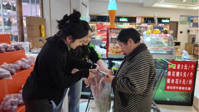 超市购物区内,各类民生商品琳琅满目,米面粮油、生鲜果蔬、日用百货等货品齐全、备货充足。居民们推着购物车有序选购,结账后凭购物小票,即可到爱心发放点免费领取洋葱。