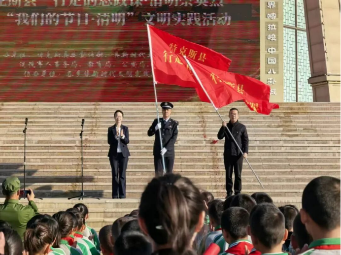 活动伊始,全体人员在中心太极坛举行“行走的思政课”开课仪式。仪式上,县委常委、宣传部部长王萍为师生代表和党员干部代表队伍授予“特克斯县行走的思政课”旗帜,激励大家以行践知、以学铸魂,让英烈精神融入血脉、见于行动。同时,围绕清明祭英烈、传承英烈精神、行走思政课知行统一等核心内容发表讲话,向全体参与人员提出活动要求与殷切期望。