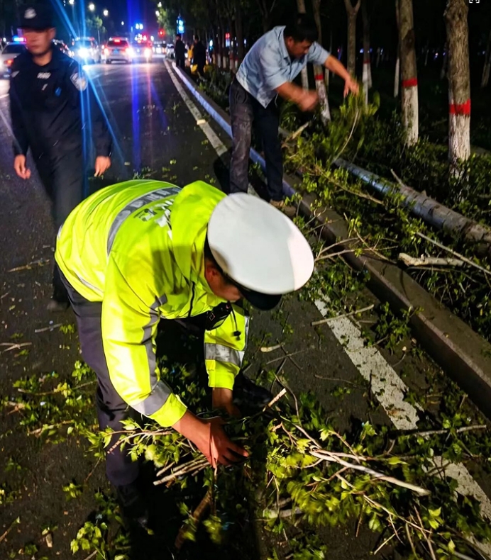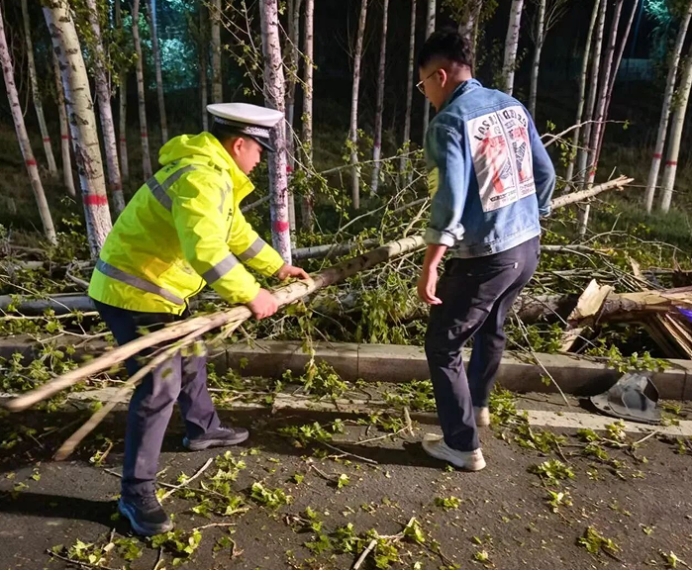 面对突发险情,执勤民辅警第一时间启动应急处置流程,迅速划定安全警示区域,提醒过往车辆减速避让。随后,民辅警主动联合现场热心群众通力协作,徒手清理倒伏的树干及散落枝叶,快速搬离道路障碍物,高效推进清障工作,及时消除了通行风险,恢复了该路段正常交通秩序。
