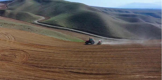 △齐勒乌泽克镇阔布村的旱田里,大型播种机来回穿梭作业 迪毛·加尼别克 摄