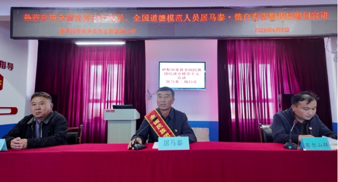 4 月 9 日,全国优秀共产党员、全国民族团结进步模范个人、中国最美乡村医生居马泰·俄白克在特克斯县乔拉克铁热克镇乔拉克铁热克牧业寄宿制小学,以亲身经历为笔、以家国情怀为墨,为全校师生点亮精神灯塔,用饱含忠诚、奉献、坚守与担当的话语,浸润每一位学子的心田。