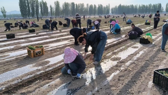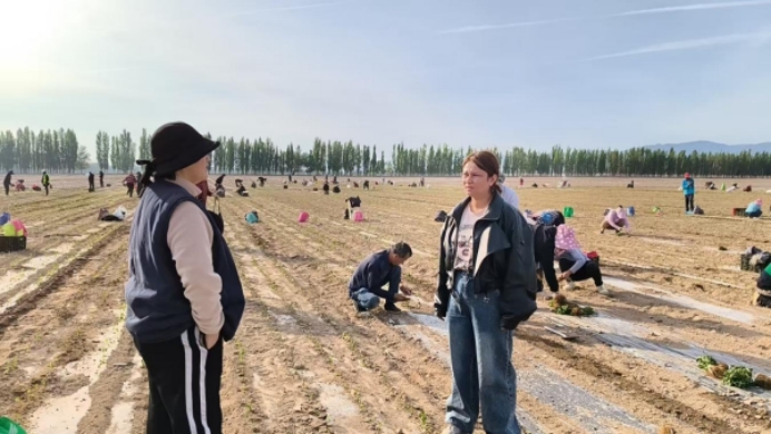 靠谱的口碑让越来越多人主动找她找活干。3月中旬,卡米拉从朋友处得知巩留县东买里镇等乡镇有1万亩甜叶菊栽种需求,急需大量务工人员。“这可是大订单!能让好多人稳定挣钱。”她立刻驱车前往巩留县,实地查看地块条件、核算务工成本,与承接公司反复协商后,敲定了“按工作量计薪”的方案:栽苗速度快、质量好的村民日薪可达380元,普通劳力日薪不低于120元,统一接送。