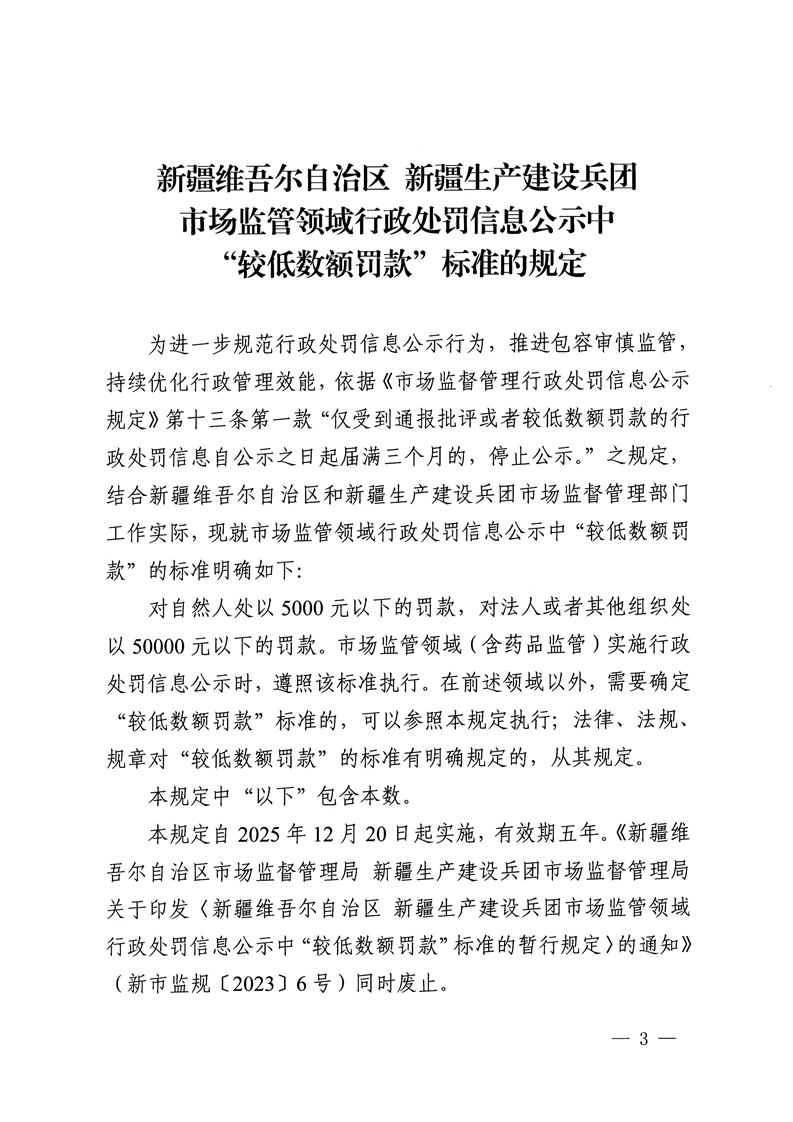 关于印发《新疆维吾尔自治区 新疆生产建设兵团市场监管领域行政处罚信息公开中“较低数额罚款”标准的规定》的通知