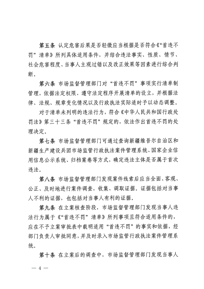 关于印发《新疆维吾尔自治区 新疆生产建设兵团市场监管领域“首违不罚”清单适用规则》的通知