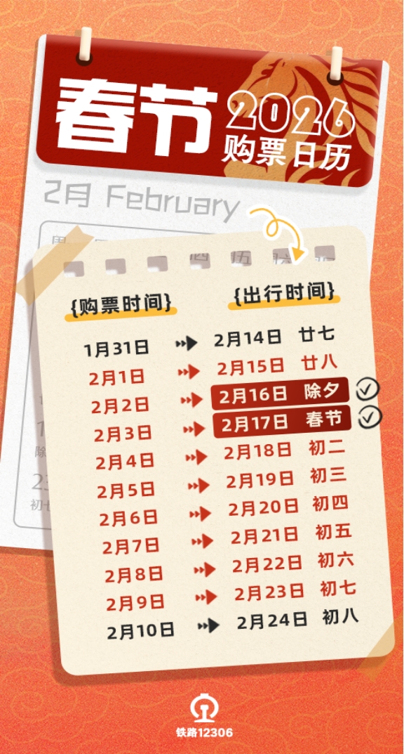 再过半个月就要开启放假模式啦春节假期的火车票也即将开售请大家记好购票时间别错过回家的车票哦下滑查收2026【春节购票日历】