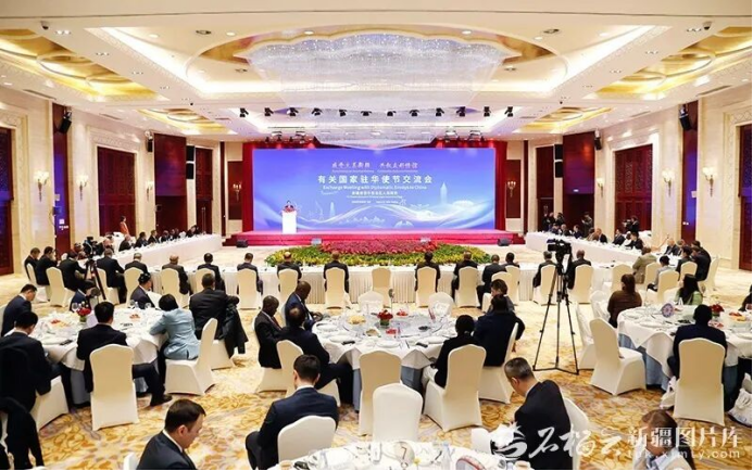 北京新疆大厦木卡姆厅洋溢着热烈友好的氛围。来自40个国家的驻华大使、外交官和有关国际组织代表出席交流会。