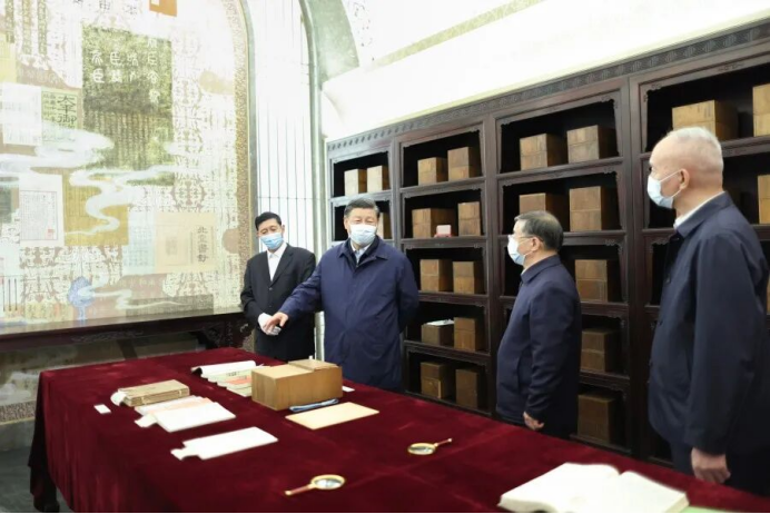 2023年6月2日,习近平总书记在北京出席文化传承发展座谈会并发表重要讲话。这是座谈会前,习近平总书记1日下午在中国国家版本馆考察时,在兰台洞库了解馆藏精品版本保存情况。新华社记者 鞠鹏 摄
