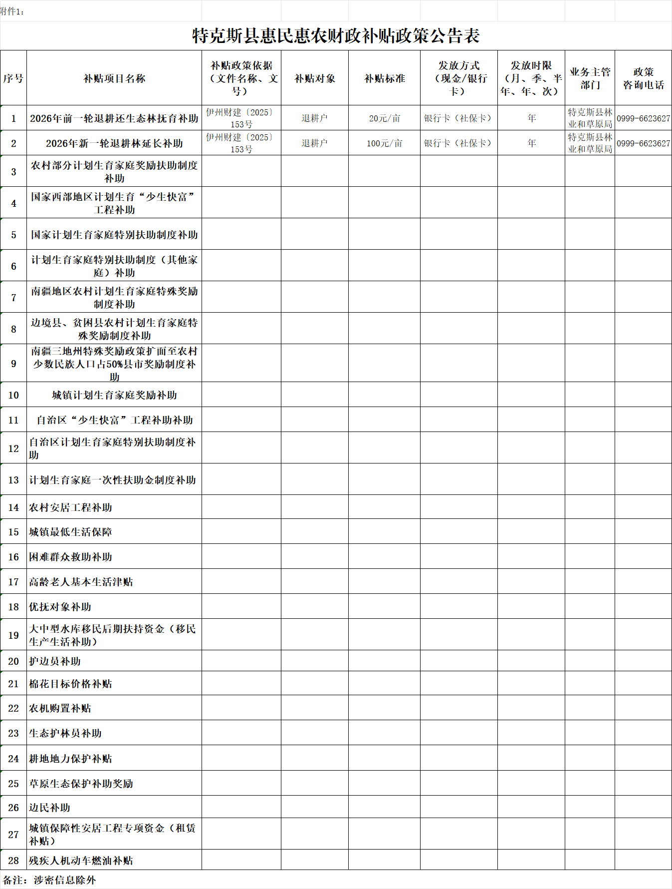 为认真贯彻习近平新时代中国特色社会主义思想,落实以人民为中心的发展理念,让党的惠民惠农政策有效落实,确保每一分惠民惠农财政补贴资金都用到群众身上,现对2026年前一轮退耕还生态林抚育补助、新一轮退耕林延长补助资金公告如下。
