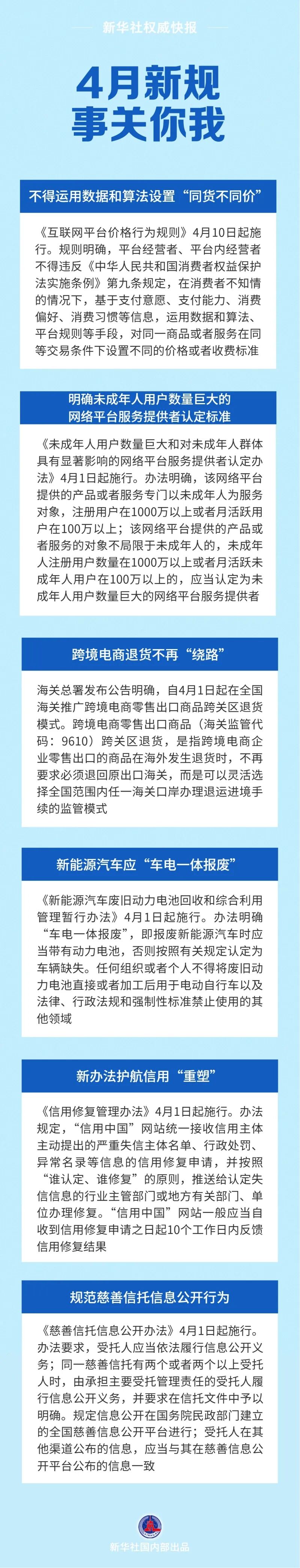“同货不同价”;明确未成年人用户数量巨大的网络平台服务提供者认定标准;跨境电商退货不再“绕路”……4月新规,事关你我,一起来看。