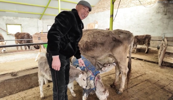 特克斯县乔拉克铁热克镇坎土曼托别村村民叶尔哈力·得依汗拜说:“我的牛生下了三胞胎,心里特别高兴,这是之前想都不敢想的事。”