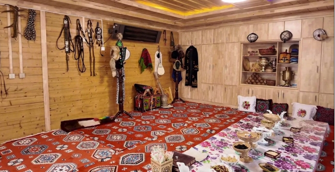 4月7日上午,记者跟房雪宁一起走进喀拉达拉镇喀拉峻村村民昂抄尔别克·赛尔山别克家的家访点,浓郁的民俗气息扑面而来。整洁木制房屋装饰,墙上挂着各式马具、手工制品,桌上摆放特色美食。昂抄尔别克·赛尔山别克指着墙上陈列的老物件,笑着介绍:“这一排都是有50年历史的马具,这个是马笼头,是我们抓马、骑马的时候必需品。这个小马鞍子,是我爷爷小时候骑过的,至今已经有80年了,我打算以后传给我儿子。你们看这件手工外套,是我奶奶做的羊皮大衣,大概有五公斤重,但是特别暖和。”