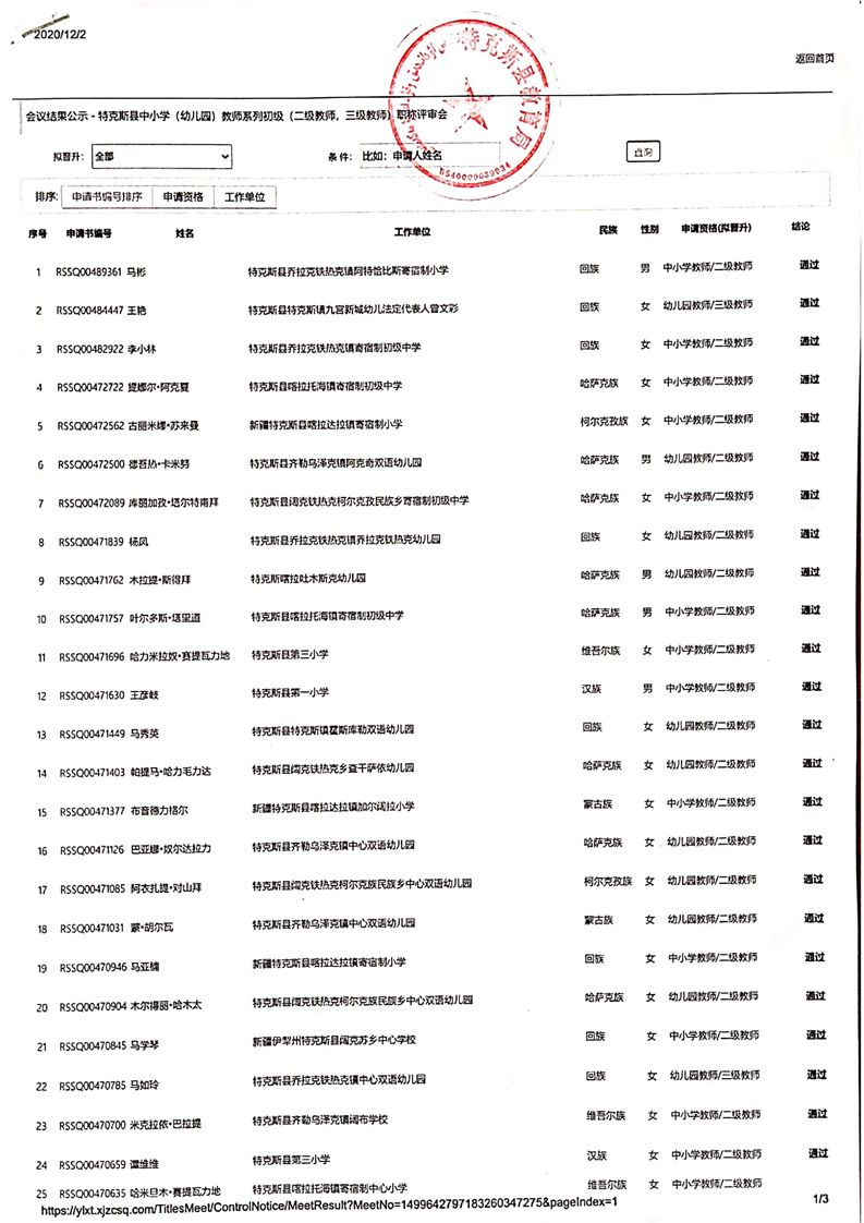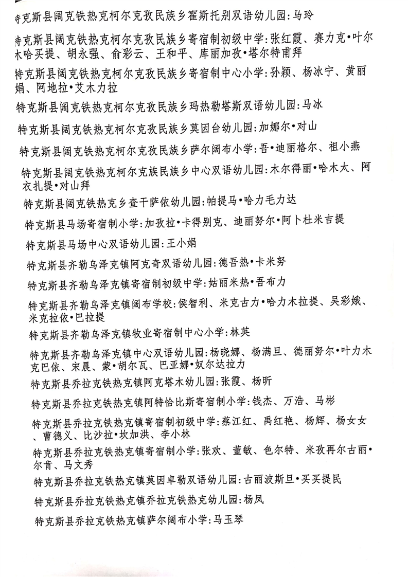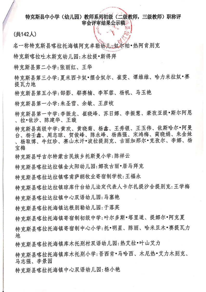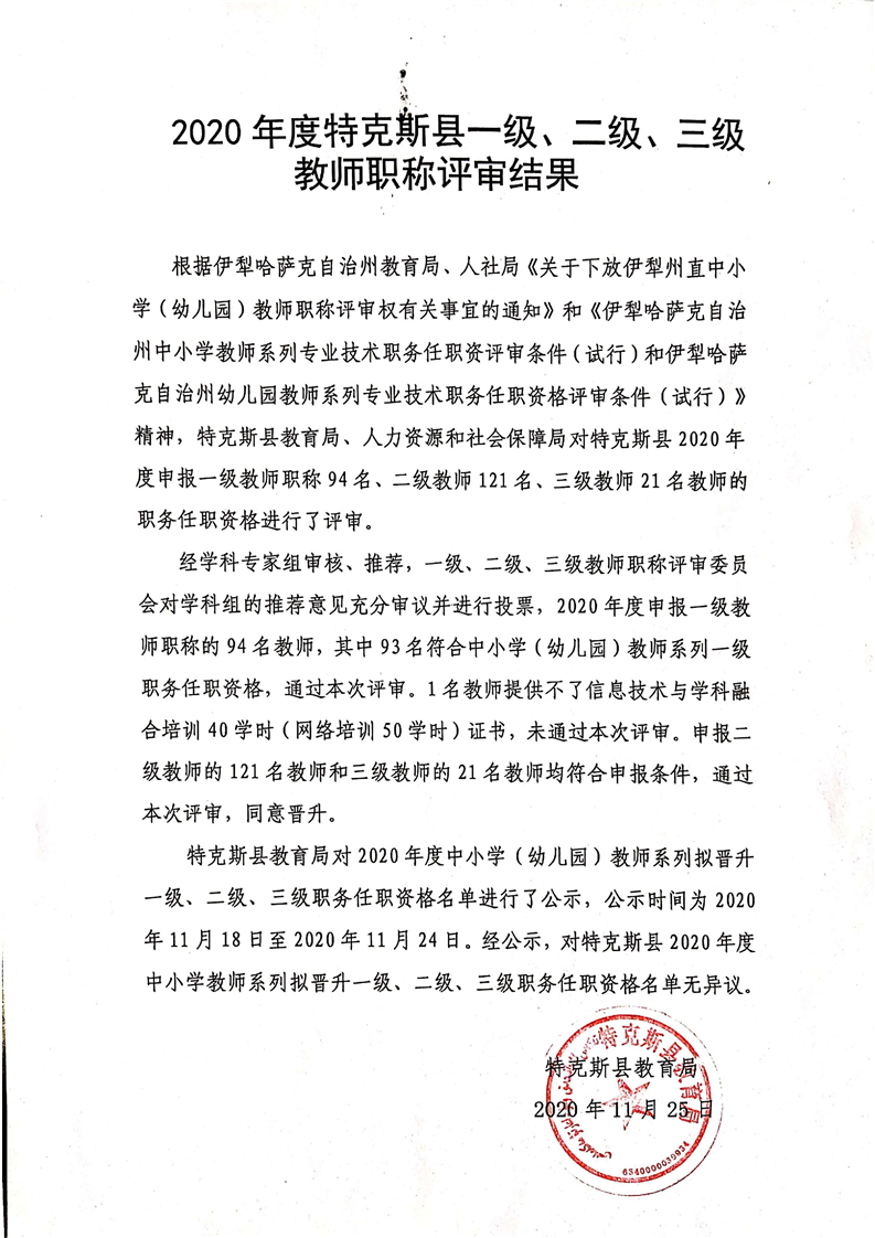 2020年度特克斯县一级、二级、三级教师职称评审结果